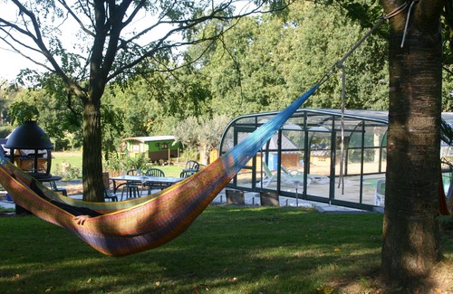 The caravan is placed in a large park with trees next to 3 other unusual accommodations (1 other caravan and 2 huts) and the covered and heated swimming pool from May to September. On the pool terrace a barbecue area is at your disposal freely.