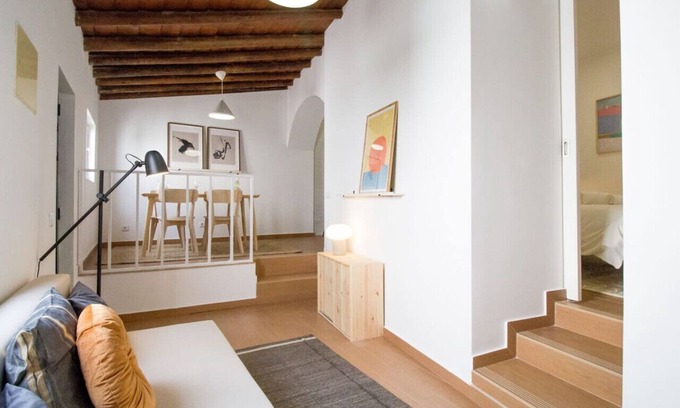 The open-concept living area features high ceilings with exposed wooden beams that add character and warmth. A comfortable sofa with stylish cushions invites you to unwind after a day of sightseeing, while a flat-screen TV and high-speed fiber-optic WiFi ensure you have everything you need for entertainment or remote work.