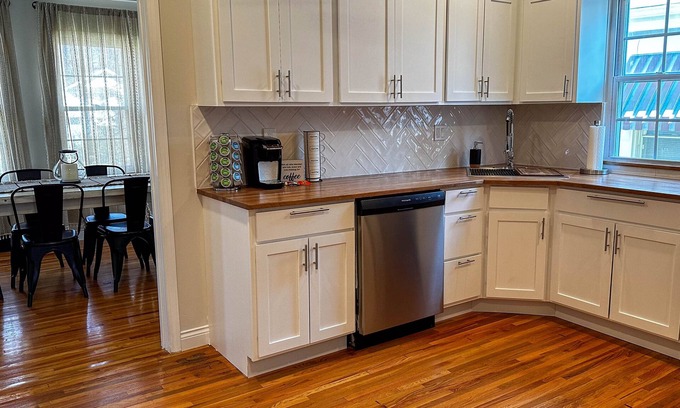 This home was built in 1925 and retains the old charm with all the modern updates and style. There are two fully private bedrooms with queen beds, full size closets with convenient shelving and smart TV’s. The kitchen is fully stocked with all your cooking needs as well as a full-size fridge, microwave and of course a Keurig. A variety of coffee and cooking spices are also available. Located at the back of the house is a full-size dining room with a large table for six and a private back yard.