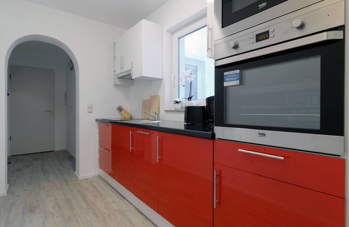 The floor of the apartment is made of vinyl, the bathroom is tiled. The kitchen is a complete fitted kitchen with dishwasher, fridge-freezer, microwave, electric stove with ceramic hob, oven, coffee machine, kettle and toaster in a set, extractor hood, window and is fully equipped with everyday utensils. The bathroom has a bathtub with shower attachment, wall-hung toilet, mirror, small cupboards, hairdryer. The two bedrooms each have a wardrobe, 2 single beds (90x200 cm) that can be combined to form a double bed, 2 bedside tables with bedside lamps, blackout windows, Berlin pictures.