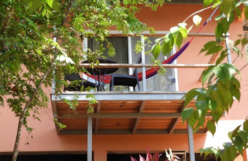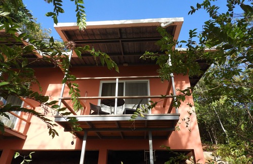 Tastefully furnished studio (25 m2) with Queen size-bed, kitchenette, modern bathroom and private deck (6 m2), AC and fan. Private shady parking close to the house. The cabaña is built in a hill which means there are stairs from the parking to the cabin. The cabin is surrounded by beautiful trees and offers sea view with spectacular sunsets. There are 2 separate studios in the building which is away from the main house and enjoys a lot of privacy. There is a pathway with stairs leading up to the pool. Beautiful Playa Punta Duarte is only a 5 minutes walk away. The surfers' paradise Playa Morrillo can be reached in 5 minutes by car or by a gorgeous 15 minutes walk.