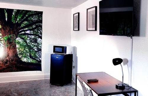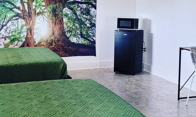 Comfortable, modern room with 2 Queen Beds. Room comes with mini fridge, microwave, and linens. Hybrid mattresses are new and comfortable for a good nights rest. Bath shower combination. TV is also available with over 170 channels. Parking is free and available. Also room for trailers in the parking lot, but space is limited.