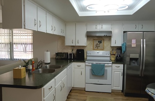 Fully equipped kitchen for cooking and baking with pots, pans, toaster, air fryer, blender, electric mixer, crock pot and also a 2 burner propane gas grill.
