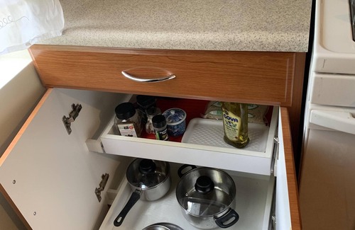 Kitchen equipped with gas stove, fridge, stainless steel pots and pans, electric pot, Nespresso coffee maker, french press, toaster, all kind of dishes, cups, glasses, silverware.
