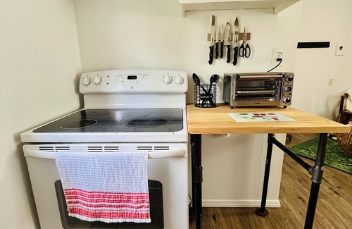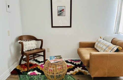 The Cozy Casita is jampacked with goods and setup to ensure you get a good night's sleep, a remote work day done and out of the way and a fun space to curl up in and get caught up on some record playin'. Not to mention that the compact kitchen has just what you need and private/carport parking is a plus!