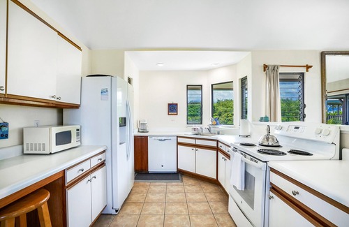 This is a two story, two-bedroom, two-and-a-half bathroom villa with a fully equipped kitchen, a comfortable living room with a flatscreen TV, and free WiFi. It has ceiling fans throughout, as well as a dining area and two lanais facing the lush tropical beauty of Kauai. Amazing sunset views of the ocean from the dining room cannot be beaten! The master suite has a lovely queen-size bed, flatscreen TV, walk-in closet, full bath, and a private lanai. The guest bedroom features a queen-size bed and ceiling fan.