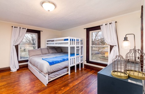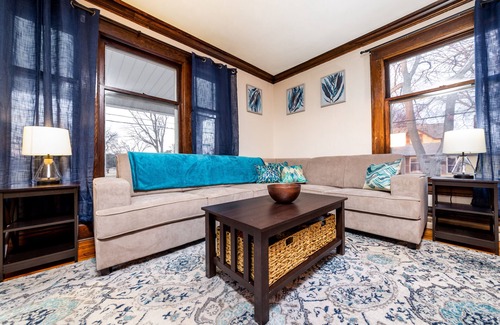 Located in a quiet, working class neighborhood in Lansing. The home has 3 bedrooms on the second floor, as well as a bonus loft area upstairs with a pull out couch and air mattress to accommodate larger groups. The main floor has a pull out sofa with a 70" Flat screen Roku Smart TV.