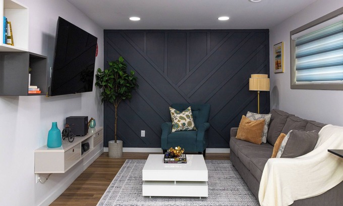Enjoy a cozy living room with 65" Roku TV in guest mode, nice lightning and a Bluetooth speaker, 3 seater sofa bed, which you can pull out to sleep 2 people.