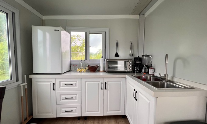 Come relax at this unique and modern 20x20 sq. ft expandable container home! This is a 2 bedroom, 1 bathroom unit resting on a beautiful 1500 sq. meter lot. There are fruit trees, flowers, vegetable plants, and the lot also includes the use of patio furniture, hammocks, BBQ grill, fire pit and even a washer machine (additional cost for laundry). The units are fully equipped with everything a guest should need including towels and dressings for the beds.