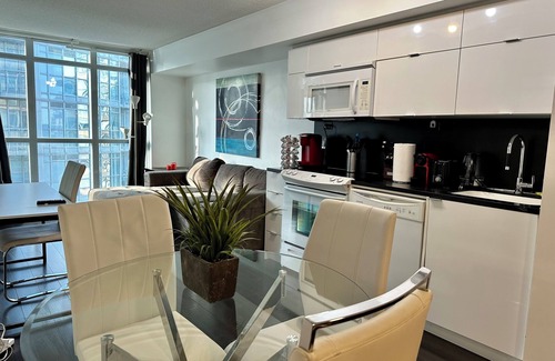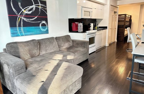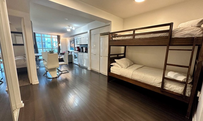 This Light Filled 1 Bedroom + Den condo, with a comfy 1 King bed + Sofa Bed + Bunk Bed + Desk. The comfort of downtown living with the essentials of home. Immerse yourself in the luxury of this modern design, clean and fresh with all the essentials . Good for couples, solo adventurers, business travelers & families (with kids). Please bring valid ID, we only issue the keys to the guest booking.