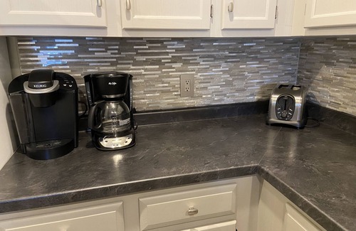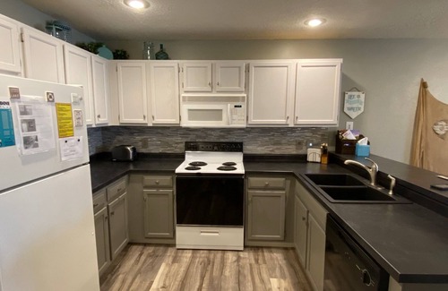 The kitchen is fully equipped with utensils, dinnerware, and appliances, including both drip and Keurig coffee makers. A dishwasher makes clean up after meals a breeze. There is seating for seven – three at the breakfast bar and four at the dining table. The dining area is perfect for family meals or playing cards or games. There is a full-size washer and dryer available for your convenience.