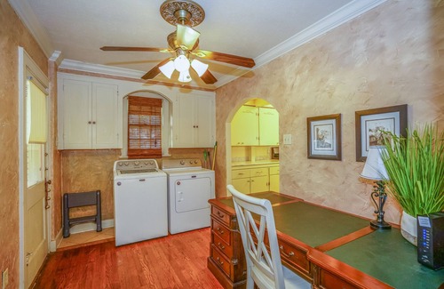 There is off-road parking for two vehicles. Additional cars can park on the road. You have access to the entire house, with the exception of the garage which we are using for storage. We provide a hair dryer and iron, and a built-in ironing board is ingeniously stored in a laundry closet that is original to the home.