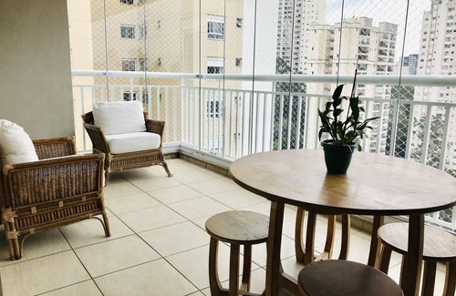Apartment fully protected with safety nets for children. Equipped in the living room with TV 55¨ and double suite with TV 39 "and net, queen size bed and 2 single beds box with auxiliary bed, gas heater, equipped kitchen, large living room, 15th floor, barbecue on the terrace, 2 garage with private deposit, leisure area with more than 8. 000,00 m2, with hiking trail, heated outdoor and indoor pools, sports court, ample and equipped gymnasium, adult and child party room, playroom, young space, playground , pizza oven and grill. Located two blocks from Morumbi Town and South Garden shopping malls. Bakery and pharmacy there are 1 block away. Quick access to Marginal Pinheiros, Rodoanel, Interlagos and other tourist points of São Paulo.