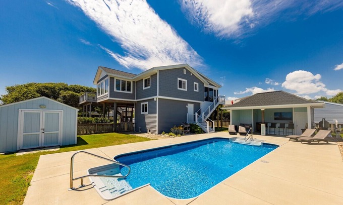 The home layout is ideal. On the first floor, you will find a Queen bedroom with access to a hall bathroom as well as access to the pool deck. The second floor, hosts the remaining 3 bedrooms. There is a King with ensuite Full Bath. Queen bedroom and an additional bedroom offering a Twin/ Double Bunkset. These bedrooms have access to a hall bath with tub. All bedrooms are equipped with TV's for your entertainment. At days end, your group will find themselves congregating in the expansive great room to watch the game, engage is casual conversation, or enjoy a good meal! The exterior of this home provides plenty of outdoor space for recreation from the new Cabana with attached half bath and Pool, the addition of a screened porch, and New Gas Grill. The yard is also fully fenced so you can play fetch with your beloved 4- legged friend. The walk to the beach is a breeze with the access path just steps from your front door! Be sure not to let this coastal charmer get away!