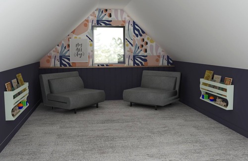 The upper level is an open space with multiple uses. Designed as a play and sleeping space for up to 8 children. The sleeping accommodations are ideal for younger children (12 and under.)