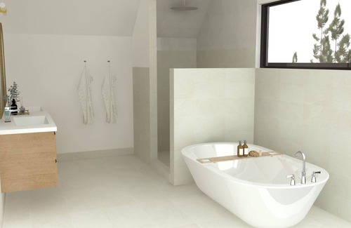 If you make your way back to the main floor, you'll be able to take the stairs to the second level. This floor hosts the 3rd washer/dryer set, two bedrooms and a bathroom. The first bedroom is the master suite, with a king sized bed, TV, and a large private en suite, including a separate soaking tub. The other bedroom is slightly smaller but also has a king sized bed, TV, and private en suite with a shower. Between the two bed rooms, a hallway allows access to the final bathroom and staircase to the upper level.