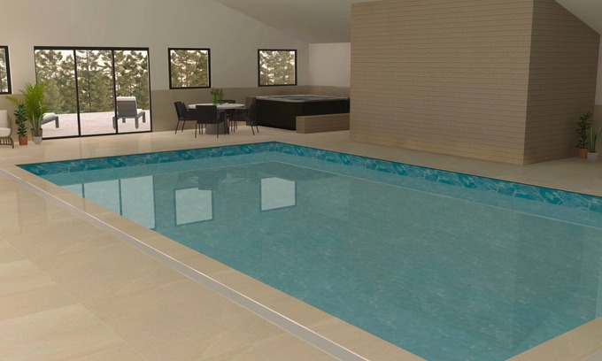 Access to the indoor pool is through a door from the main floor into the backside of entry way, entirely indoors. You'll pass a washer/dryer and a half bath. The building is brand new with a 36’ x 20’ heated pool, and diving board. A 7 person hot tub nestled in the corner allows for a full view of the pool as well as the backyard through the picture window. There is additional counter space and a beverage fridge between the hot tub and the sauna. The floor is heated, making it perfect for year round swimming and leisure.