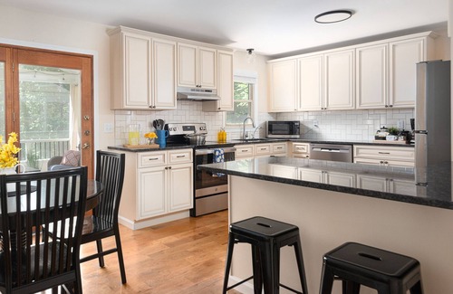 You will find the kitchen is fully stocked with new stainless steel appliances and all your cooking essentials including: coffee maker, toaster, hot water kettle, pots, pans, dishware, silverware, reverse osmosis filtered water, and more.