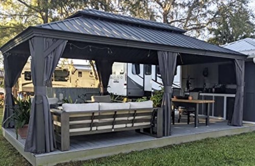 The new courtyard has two hot tubs, a conversation area with a propane fire, a 36" propane grill, all covered by gazebos (also screened and solid curtains) for use 365 days a year! There are also 2 charcoal BBQs and 1 charcoal smoker. Please bring your own charcoal.