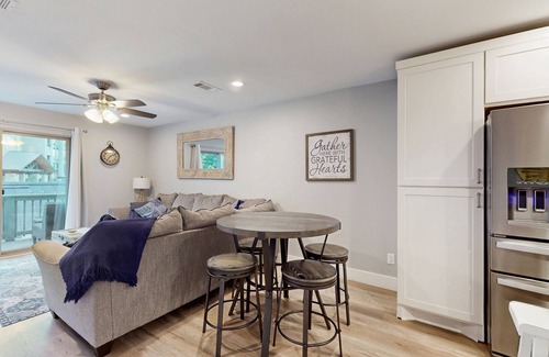 Make the most memorable and loving memories with your loved ones at this charming, family-friendly condo! Located just mere steps from the waters of Horseshoe Bay and a short walk to Horseshoe Bay Resort, this home away from home is calling your name. It boasts a gorgeous and light-filled open floor plan seamlessly combining the kitchen, dining area, and living room. The living room boasts a soft and inviting L-shaped sofa and a large flatscreen Smart TV. Let your loved ones rest and unwind while you treat them to a delicious meal or midday snack thanks to the fully-equipped kitchen. It boasts incredible stainless steel appliances, including a French-door fridge, stove, oven, microwave, and dishwasher, a Keurig coffee maker, and a gorgeous island with marble countertops and six stools. The living room opens up to a convenient balcony with a couple of patio lounge chairs. There is a small laundry room equipped with a washer/dryer combo for your laundry needs–now you can pack as light as you want!