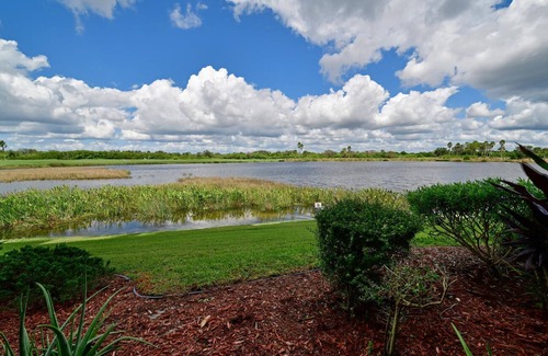 River Strand condo overlooking the 7th hole on Estuary. Stunning views overlooking an active wildlife sanctuary. Enjoy the quiet, serene setting from your kitchen, living room, or screened lanai. You’ll see a variety of birds and ducks at any given moment along with the gator that cruises the lake daily. Catching a glimpse of the occasional otter, white pelicans, or bobcat is a special treat.