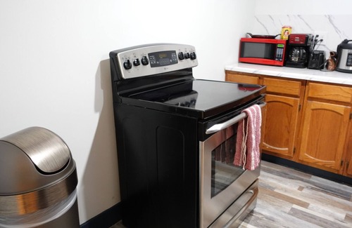 one bedroom 1 queen bed, phone chargers,55 tv, one kitchen with microwave and kitchen utensils, refrigerator and coffee maker. one restroom and living room with fold out couch bed, board games like chess, UNO play cards and dominos.