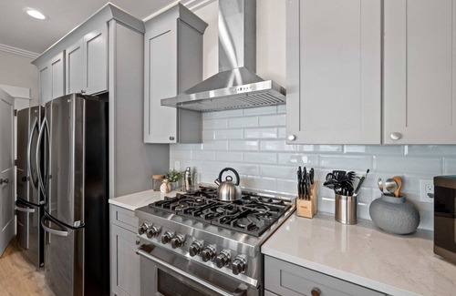 - Kitchen equipped with up-to-date appliances, large island, and direct access to the deck.