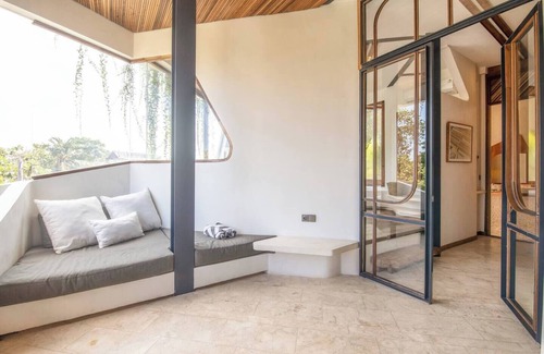 The loft dazzles with antique Balinese doors, a chic coffee and cream color palette, teakwood accents, and abundant natural light. Inside, you'll find an air-conditioned bedroom studio with a built-in king-size bed, a laptop-friendly worktable, a 43-inch Smart TV with streaming services, and a Bluetooth speaker system. Decorative artifacts add extra charm, while blackout curtains, bedside electrical sockets, an in-room safe, and a wardrobe cabinet enhance convenience. Fresh linens and a daily turndown service ensure comfort.