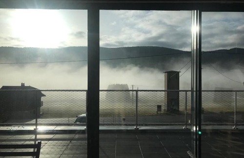 Quite incredible panoramic through view from the main room (feeling of being in the middle of nature), fitted kitchen as at home open onto a terrace and view of the Risoux forest, living room set facing Switzerland, dining room facing the sunset.