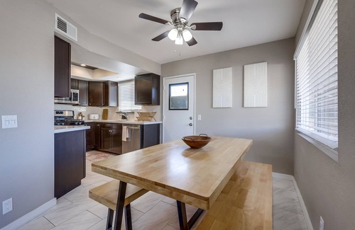 There is a gas fireplace and wall mounted, flat screen TV in the family room, and high speed wireless internet. The dining area seats 4 to 6 comfortably. There isn’t central air conditioning but there is a wall a/c unit in the family room with ceiling fans throughout to keep you quite comfortable during your stay. This vacation home also offers a shared, full size washer & dryer.