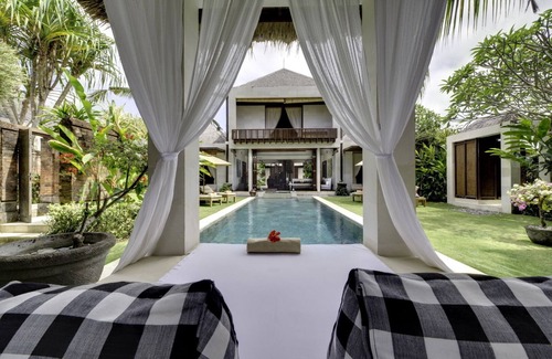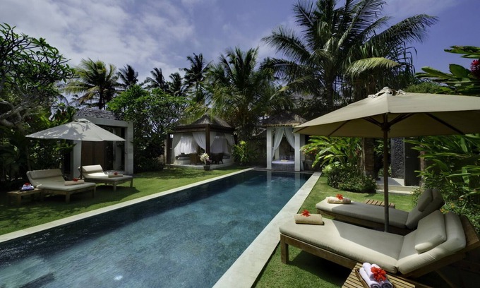Located on the Southeast coast of Bali, The villa, is a double-story pool villa of contemporary design mixed with traditional Javanese architecture. Exuding tropical comfort, the villa showcases a sweeping courtyard with lush lawn and greenery aplenty, an outdoor swimming pool, a bale and has own private access to the beach lounge area. Indoor living spaces are evocative chic, mixing hardwood timber panels with elegant furnishings. Selected art pieces large and small feature on walls and elevated surfaces.