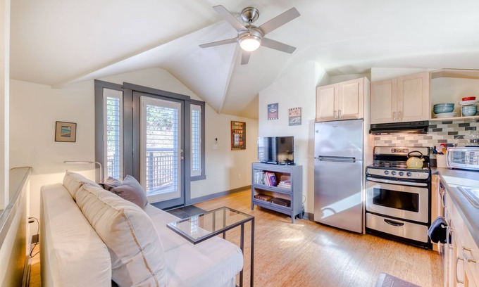 Perfect for a solo traveler or vacationing couple to lay their heads at night, this modern studio offers a peaceful and private escape in one of Portland's most popular neighborhoods. Take your morning coffee out on the private balcony as the city wakes up along with you. You can bring your fresh local produce home with you and cook dinner in the full kitchen. When you lie down for bed, unwind with a favorite cable show playing on the flatscreen TV.