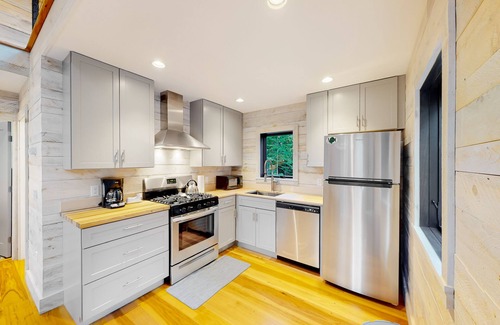Kick back in the open living area, where a woodstove provides a cozy ambience for movie nights. Upstairs, settle into the furnished loft with a mug of hot tea and a good book on rainy or snowy days. A private washer/dryer and fast WiFi add convenience to longer stays.