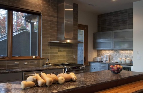 This modern lake house has unique architectural influences, with a magnificent view of the lake that makes for a perfect relaxing get away.