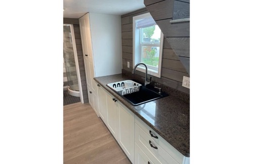 This tiny home has a queen bed in loft and a sectional couch that can be used as a bed for two smaller people that are 5 feet 8 inches tall or less. It has a microwave, oven and cooktop, large sink and refrigerator. There is a TV in themain living area that drops down via remote control. The tiny home is temperature controlled by a mini-split that both cools and heats the unit year round. It also has a sound system that operates blue tooth and//or connects to TV. There is available a fold out table and chairs for dining and use for laptop.