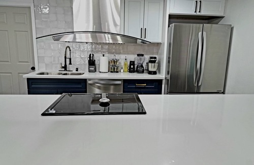 Immerse yourself in a vibrant, open-concept layout highlighted by a state-of-the-art kitchen, adorned with dazzling quartz countertops, contemporary white shaker cabinets with soft-close features, and premium stainless-steel appliances. The kitchen is fully equipped with everything you could need to cook up all your favorite meals, from the freestanding oven and cooktop to the large fridge/freezer. You have access to quality cookware, dinnerware, and utensils along with a coffee machine to get your day started right and all the cooking essentials right at your fingertips. Eat together at the elegant dining table with seating for 10 guests (You will find 4 additional chairs in the casita/lounge). We provide complimentary Oil, season, coffee, tea, sugar, garbage bags, napkins, and some bottles of water.