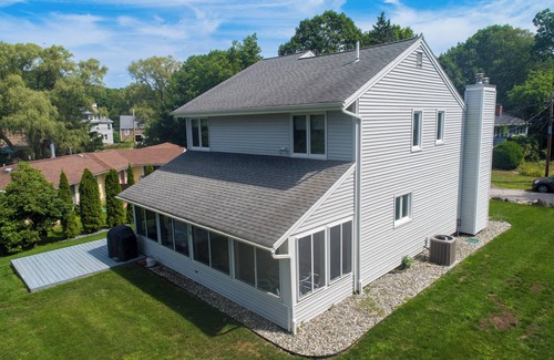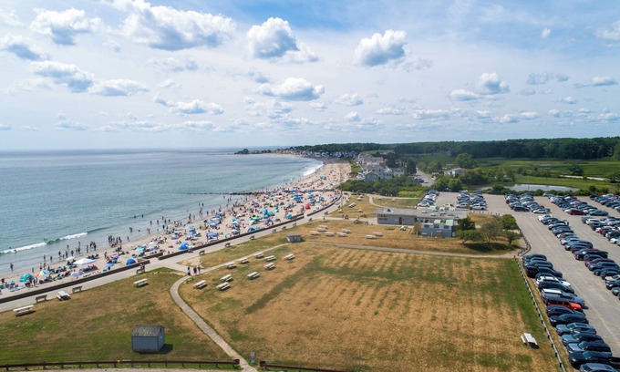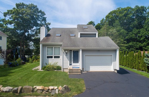 As the aerial photos show this Rye Ocean Mist updated contemporary Cape is very short stroll to beautiful Wallis Sands State Beach. On the first floor there is a spacious cathedral ceiling living room with new slip covered Pottery Barn style furniture, fully applianced kitchen with breakfast bar open to a large dining area, half bath and laundry area. There are three generously sized bedrooms on the second floor. The master has its own en-suite bath, with a Maine Woodworks queen bed; the second bedroom has a Maine Woodwork queen bed; and the third bedroom is furnished with two Pottery Barn bunk beds. There is also an additional full bath on this floor. Rear of the home a features a large sun porch to enjoy after a fabulous day at the beach. There is also a deck with a gas grill. The home has central air and an oversized one car garage. Additional parking for three cars.