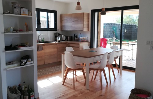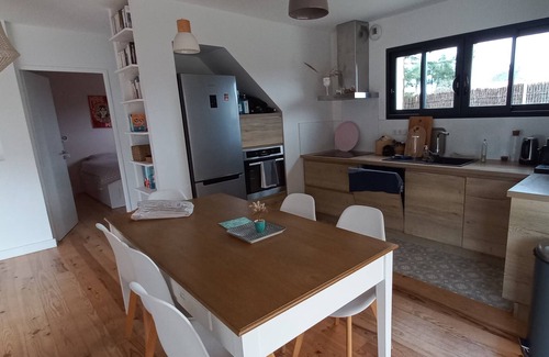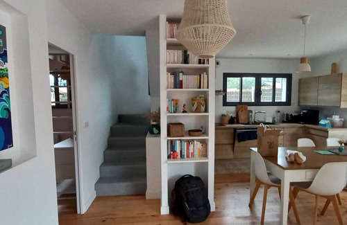 New house 100m2 comfortable in Contis-beach, feet in the sand, 300m from the ocean and 100m from the current, in the heart of the village, on a fenced plot of about 150m2 facing South and East.