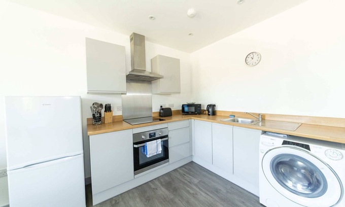 This contemporary 1 bedroom apartment is set within a peaceful development close to Blackburn town centre. The apartment is equipped with everything you need to enjoy a comfortable stay, including free wifi, a fully fitted kitchen/open plan living area, clean and modern bathroom with complimentary toiletries and towels, and a comfortable double bedroom. Free on site parking is also available.
