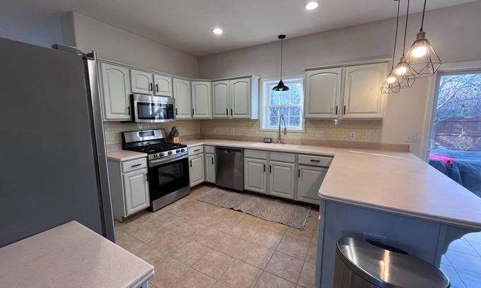 Forget your worries in this spacious and serene space. Private, fenced in backyard with firepit. Conveniently located home in a quiet and peaceful neighborhood. Close to local attractions, parks, trails, downtown, bars and restaurants. Laundry on site!