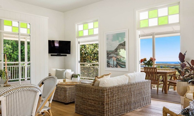 Nestled within verdant hinterland greenery just beyond Byron Bay, Coolamon Studio offers an enchanting self-contained Queenslander cottage perfect for couples seeking a romantic escape. This elegant 1 bedroom, 1 bathroom studio features a spectacular wraparound verandah showcasing breathtaking panoramic ocean views, with clever architectural design maximising both comfort and functionality.