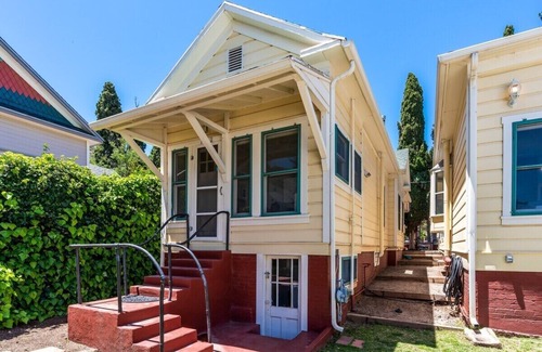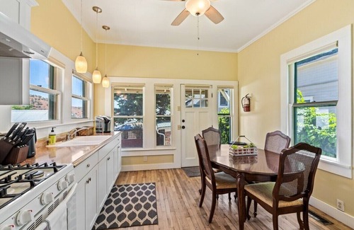 The Copper Queen Cottage is a one bedroom home situated on the same lot as the Copper Queen Retreat. Built in 1901 this home strikes a beautiful balance between preserving it's history and character, while being fully updated with modern comforts. The shotgun style home welcomes guests in though the living room (with a pull out sofa with a memory foam mattress), where they pass through the bedroom into a hallway with a closet and bathroom, this hallway ends with the kitchen that then opens up to the small backyard space. The washer and dryer are tucked into the basement which has an exterior entrance.