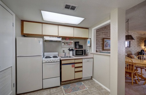 Yes, Coral Cay #107 features a fully equipped kitchen. It includes a stove, oven, microwave, refrigerator, and dishwasher. The kitchen is also stocked with essential cookware and dining ware, such as pots, pans, plates, utensils, and more—everything you need for preparing and enjoying meals during your stay.