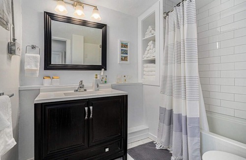 Bathroom is stocked with: hand soap, towels, garbage bags, hair dryer, and first aid kit.