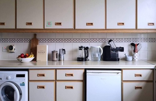 The kitchen has a fridge, a hob, an oven, a kettle, and a freezer. A washing machine, cordless hoover, hair dryer, and clothes hanger are provided.