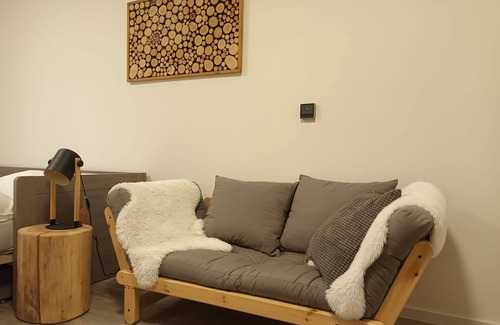 The property has a stylish and modern furnishing style. The kitchenette is well-equipped with essential appliances like a microwave and kettle, allowing you to prepare simple meals during your vacation. The living/sleeping area is conveniently combined, providing a comfortable and efficient use of space.