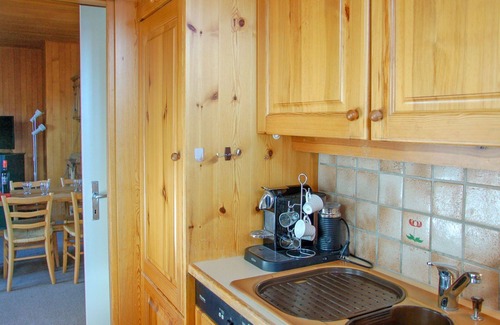 The apartment is suitable for a vacation stay, accommodating a maximum capacity of 6 people with its 3 bedrooms and 1 bathroom. The kitchen is well-equipped, featuring appliances such as a dishwasher, microwave, and various cooking utensils like a raclette grill and fondue set for cheese. The balcony provides an opportunity to enjoy the picturesque views during your stay.