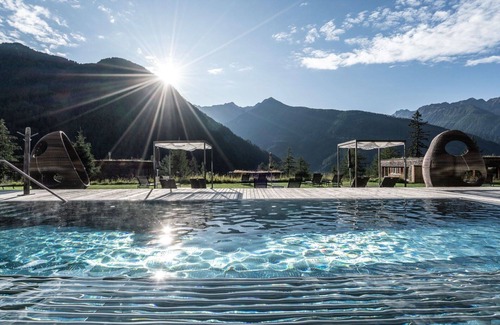 The Gradonna Mountain Resort is a child-friendly chalet located at an elevation of 1,450 meters above sea level in Burg, Austria. This holiday rental offers a range of amenities including a swimming pool, yard, internet WiFi, EV charging station, and an installment plan option. The chalet boasts a shared property with plants and an indoor heated pool available seasonally from June 15 to October 31. Additionally, it features a natural swimming pond.
