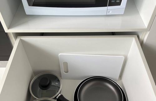 • Fully equipped with a stovetop, microwave, fridge, kettle, and essential cookware for preparing meals.