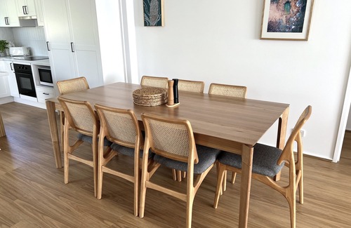 The fully-equipped kitchen makes meals a breeze with a large fridge and freezer, dishwasher, induction cook-top and oven. The adjacent dining area seats up to eight guests for memorable shared meals.